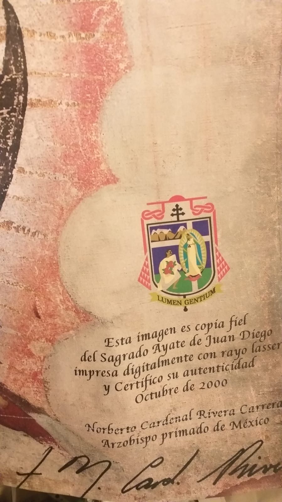 E così lui, il 17 Settembre del 2019 nella Basilica di San Giuseppe al Trionfale, dopo una Santa Messa, mi ha consegnato con mia sorpresa e stupore il Santo Manto e una tele con l’immagine della Santa Vergine di Guadalupe impressa digitalmente al laser, come da Tilma di Juan Diego e certificata dal Cardinale Rivera Carrera del Mexico con la documentazione e attestato da parte della commissione dell’Apostolato della consegna e custodia del Manto n. 449.